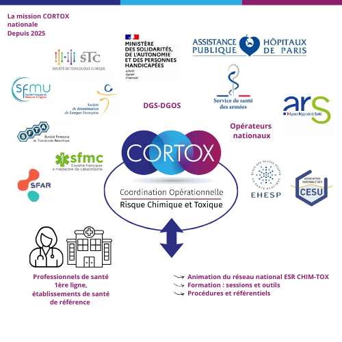 La mission nationale CORTOX a été officiellement lancée le 6 octobre 2025 pour animer le réseau des établissements de santé de référence (ESR) pour une prise en charge des patients à exposés aux risques chimiques. Son objectif est de préparer et accompagner les acteurs de la prise en charge clinique, à chaque étape du parcours du “patient exposé au risque chimique”
